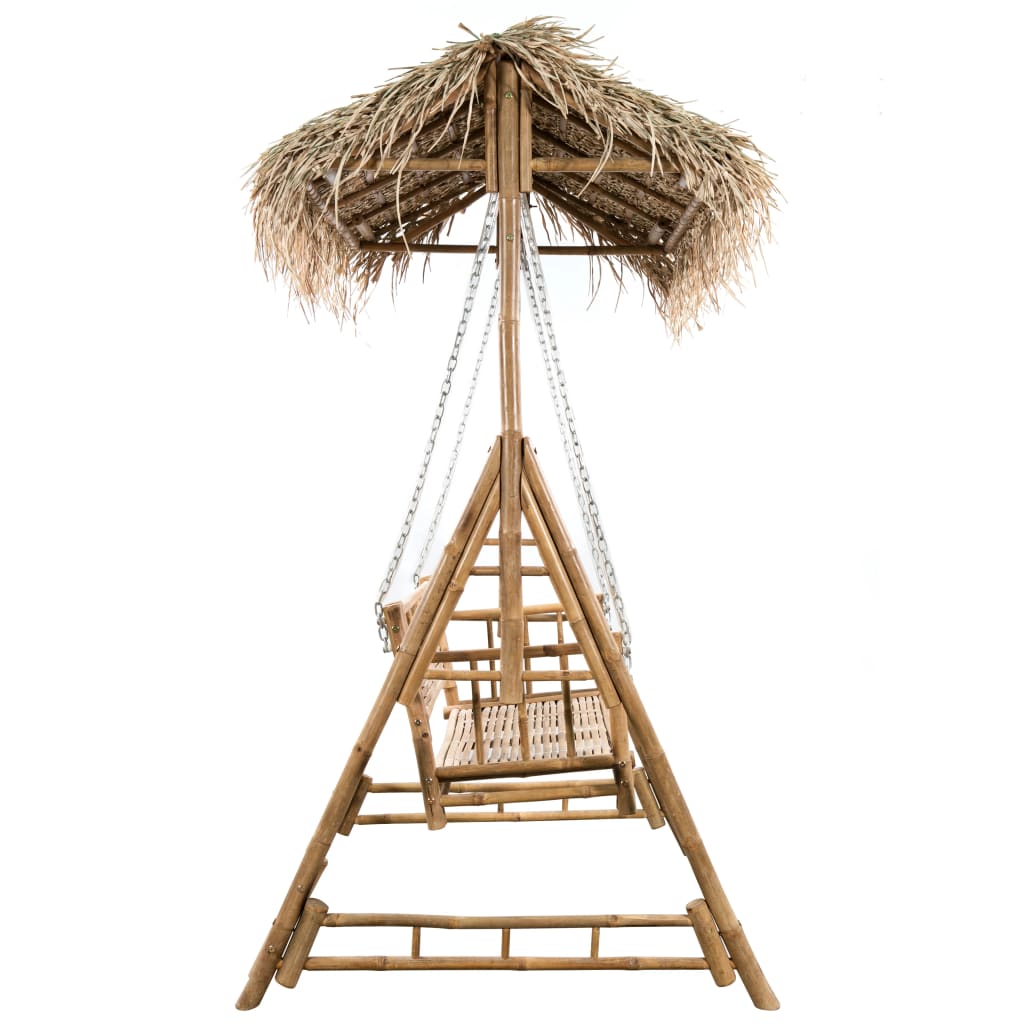 Deze 2-zits schommelbank is een uitstekende keuze voor ontspanning en plezier met je familie en vrienden in de tuin en op het terras of balkon. De schommelbank is vervaardigd van weerbestendig en duurzaam bamboe. Hij heeft een overkapping die bedekt is met palmbladeren en geeft je buitenruimte een tropisch tintje. De schommelbank wordt opgehangen met metalen kettingen om optimale veiligheid te garanderen. Bovendien zorgen de meegeleverde kussens voor extra comfort tijdens het loungen. Elk kussen heeft twee sets touwtjes voor stevige bevestiging aan de bank. Geniet van een zomerbriesje op deze comfortabele en decoratieve schommelbank!