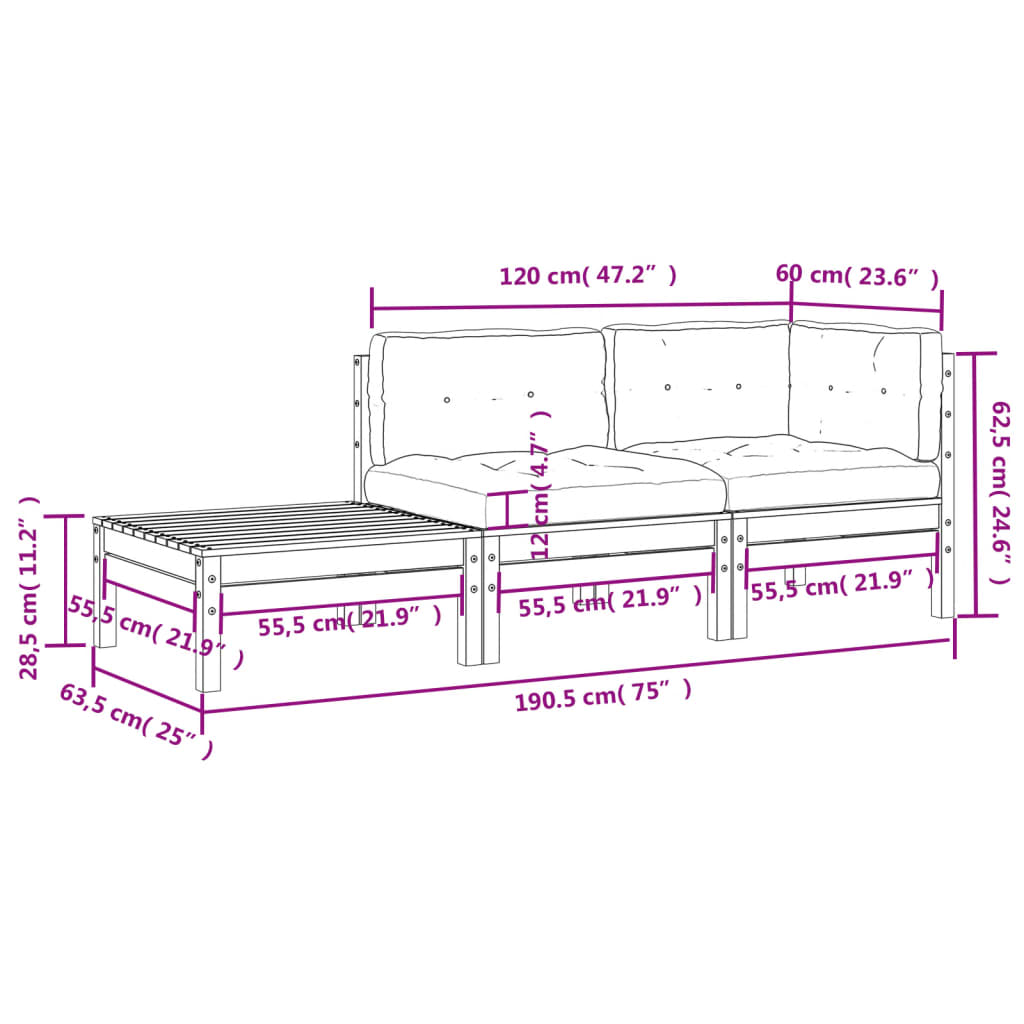 Deze 2-zits houten tuinbank met kussens en voetenbank is een fantastische aanvulling op je tuin of terras en is perfect om gezellig met je familie of vrienden te kletsen of van het weer te genieten. Geïmpregneerd grenenhout: massief grenenhout is een prachtig, natuurlijk materiaal. Grenenhout heeft rechte nerven en de noesten geven het een kenmerkende, rustieke uitstraling. Impregneren is een conserveringsproces dat wordt uitgevoerd met behulp van autoclaven.De drukbehandeling verhoogt de weerstand tegen rotting en water.Comfortabele zitervaring: de rugleuning en de dikgevoerde kussens zorgen ervoor dat de tuinbank comfortabel is om op te zitten.Veelzijdig te gebruiken: de tuinvoetenbank kan niet alleen worden gebruikt om op te zitten of je voeten op te leggen, maar ook als salontafel voor je drankjes, eten en andere decoraties.Gelat ontwerp: het lattenontwerp van de palletbank voorkomt waterophoping, waardoor de zitting droog blijft en rotting wordt voorkomen.Modulair ontwerp: de houten tuinbank heeft een modulair ontwerp, waardoor hij volledig flexibel is en eenvoudig aan elke omgeving kan worden aangepast. Je kan hem combineren met andere modulaire segmenten, verkrijgbaar in het dropdownmenu, om je eigen persoonlijke loungeset samen te stellen! Goed om te weten:Om de levensduur van je tuinmeubelen te verlengen, raden wij je aan om de meubelen met een waterbestendige hoes af te dekken. Maximaal 110 kg per zitting. Wees je bewust van het risisco van open vuur en andere warmtebronnen in de nabijheid van het product.